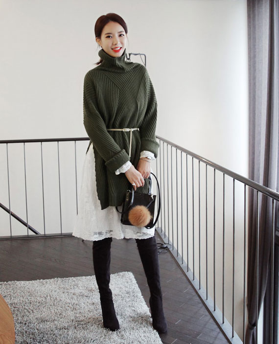 Chân váy ren xòe nhẹ nhàng và điệu đà khi kết hợp với váy len cổ lọ xẻ hai bên hông