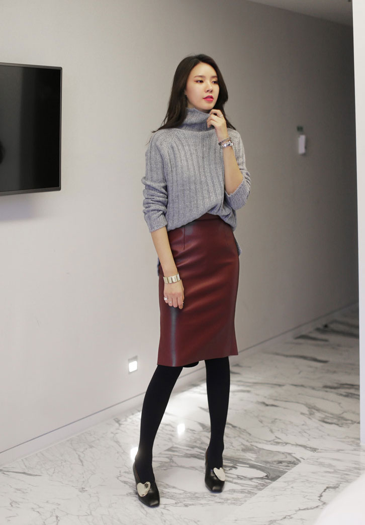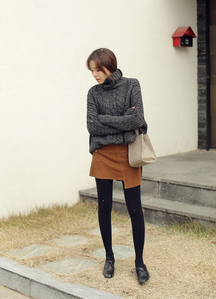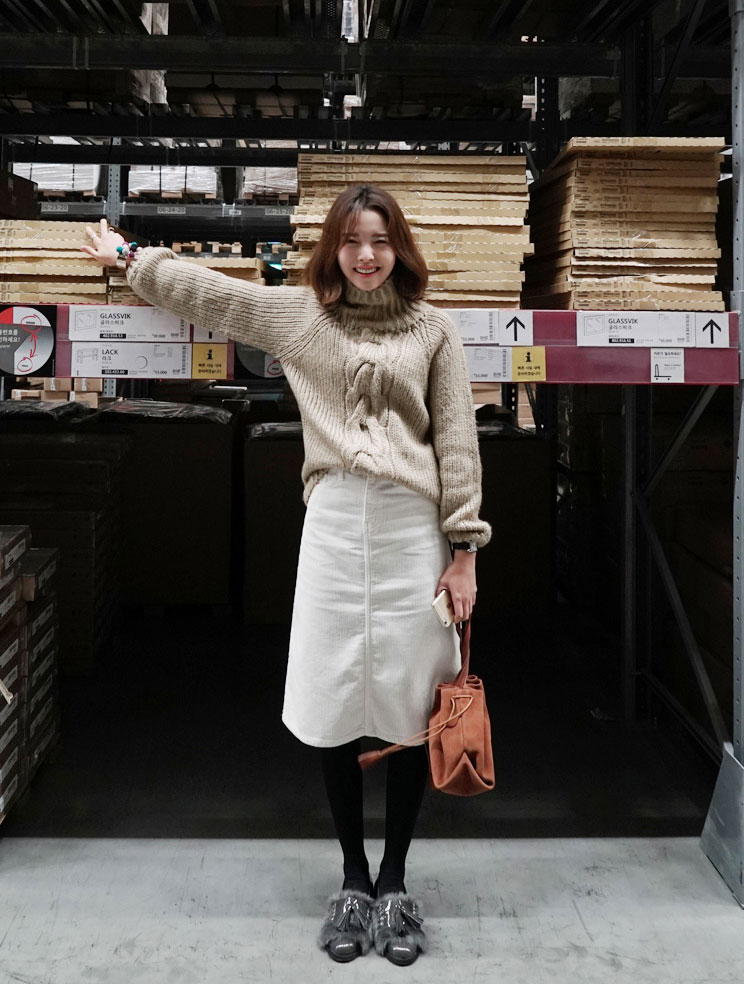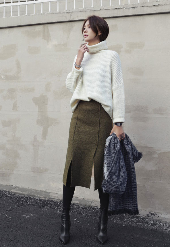 Ngoài ra, thật nữ tính và điệu đà khi áo len cổ lọ được kết hợp với chân váy len