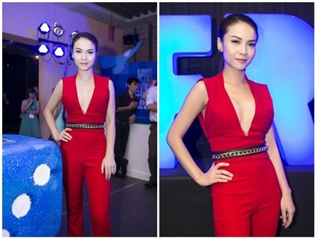 Một trong những thiết kế tôn vóc dáng Yến Trang, cô không quên chọn mẫu váy có cổ áo chữ V sâu gần chấm rốn. |