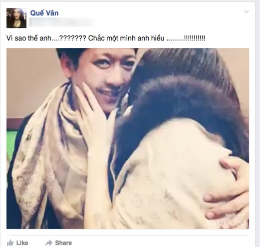 Theo tâm sự của cô nàng, thì trong thời gian vẫn còn đang là bạn trai của diễn viên Nhã Phương, Trường Giang đã có mối quan hệ tình cảm với Quế Vân và gây cho cô rất nhiều đau khổ.