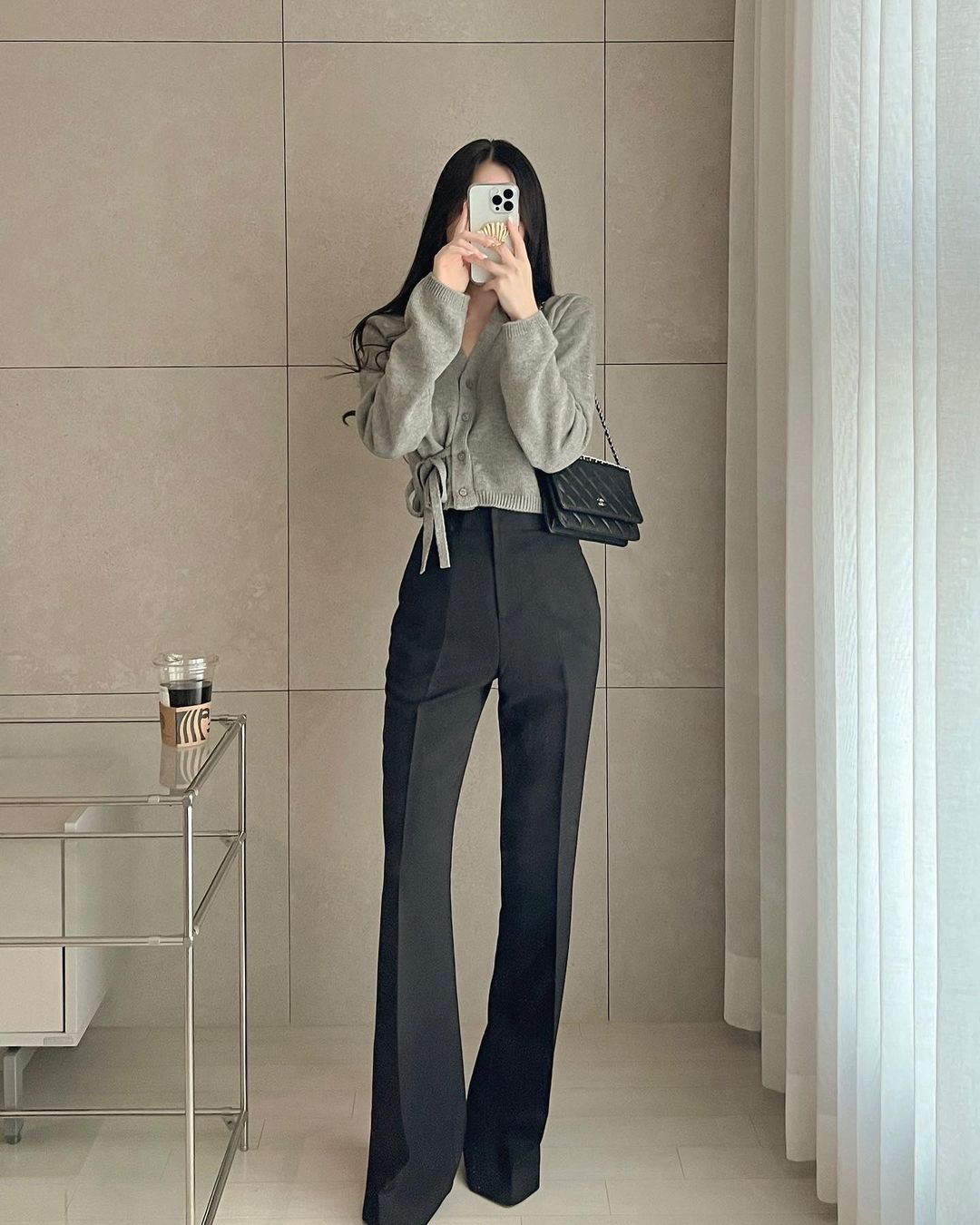 Khi đến sở làm, bạn cũng có thể diện áo len mỏng với quần âu quen thuộc. Cô nàng này chọn dáng quần cạp cao, mix cùng giày cao gót để hack chân dài hiệu quả
