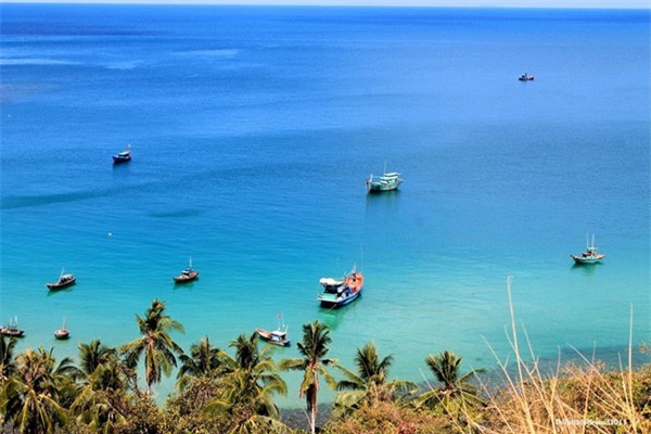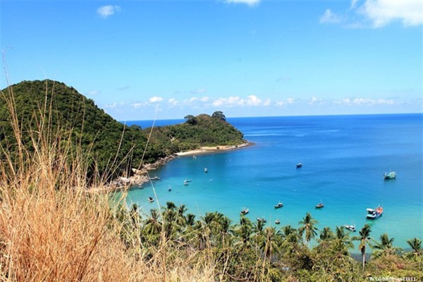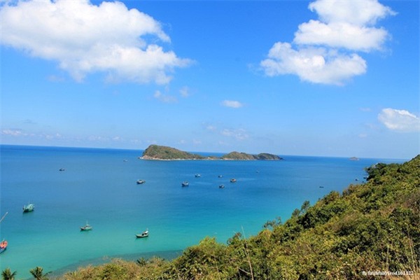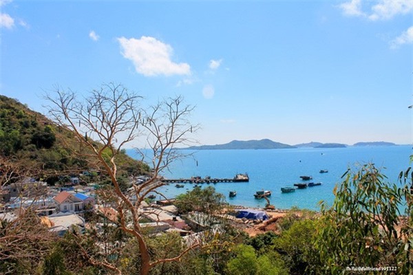 hòn đảo nhỏ phía xa xa, đâu đó thấp thoáng những chiếc thuyền đánh cá,