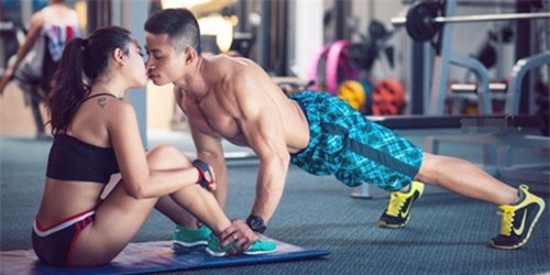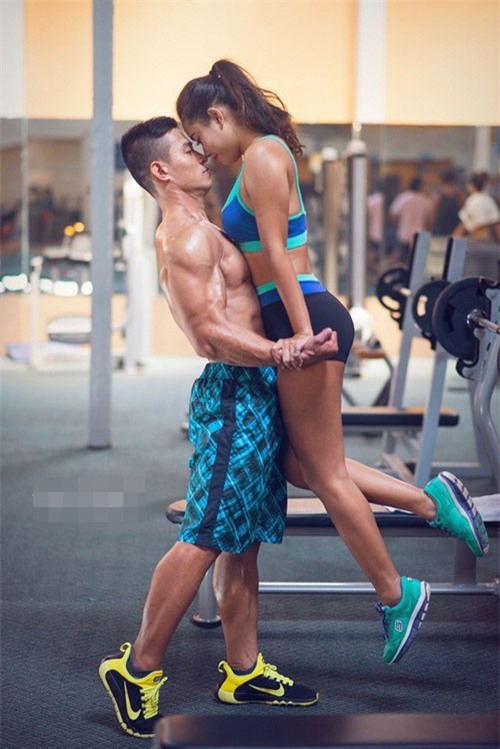 bối cảnh ở phòng tập gym, cặp đôi kề vai sát cánh bên nhau luyện tập.