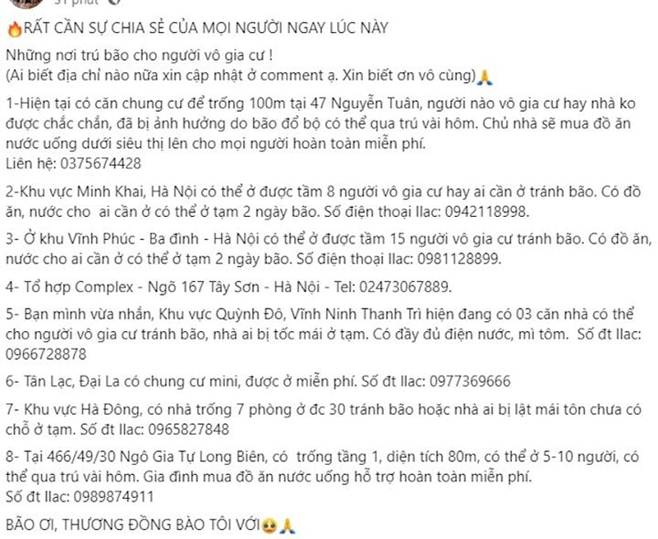 Những tấm lòng như chị Phương Anh không hiếm. Trên Facebook tối 7/9 có rất nhiều thông báo dành chỗ ở cho những đồng bào đang cần. Diễn đàn Oto+ còn có một bài đăng tập hợp những địa chỉ có thể đón người đến trú bão ở Hà Nội, giúp kết nối bên cần nơi nở và các nhà hảo tâm. Trong hơn 400 bình luận bên dưới bài này, có rất nhiều bình luận ghi rõ địa chỉ, số căn phòng còn trống và số người có thể đón nhận, cùng với số điện thoại liên lạc. Ngoài chỗ ở, các nhà hảo tâm - bao gồm cả cá nhân và các cơ sở kinh doanh - còn chuẩn bị sẵn đồ ăn và các phương tiện sinh hoạt cơ bản.