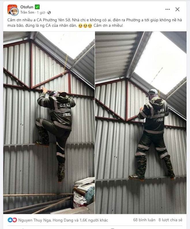 Người dân chia sẻ hình ảnh công an phường Yên Sở, quận Hoàng Mai, Hà Nội đến giúp đỡ không quản bão giông. (Ảnh: Trần Sơn)