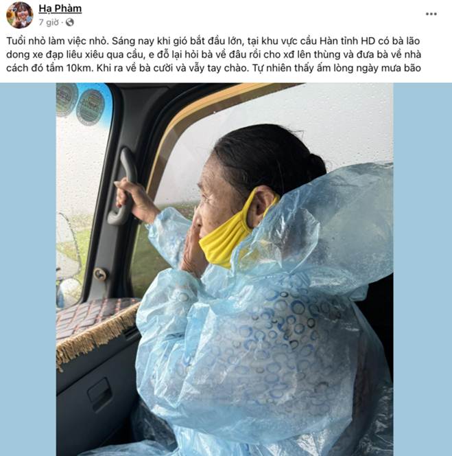 Ngoài ra, trong thời gian bão Yagi hoành hành, cư dân mạng cũng chia sẻ nhiều khoảnh khắc ấm tình người khác, cho thấy lòng vị tha, sự đoàn kết, yêu thương nhau của người Việt Nam trong hoàn cảnh khó khăn, như chuyện anh công an phường ở Yên Sở đến giúp người dân neo đơn, hay một bà cụ liêu xiêu dắt xe đạp qua cầu được một tài xế ô tô chở cả người lẫn xe đưa về tận nhà cách 10km...