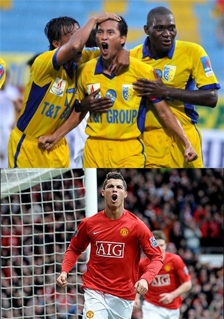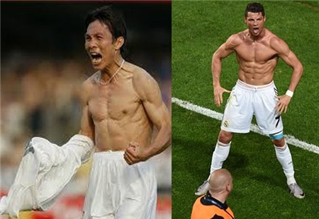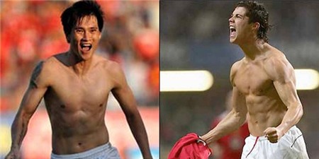 Công Vinh cũng từng bắt chước kiểu dang rộng hai chân ra để tạo dáng trước khi sút phạt của Ronaldo