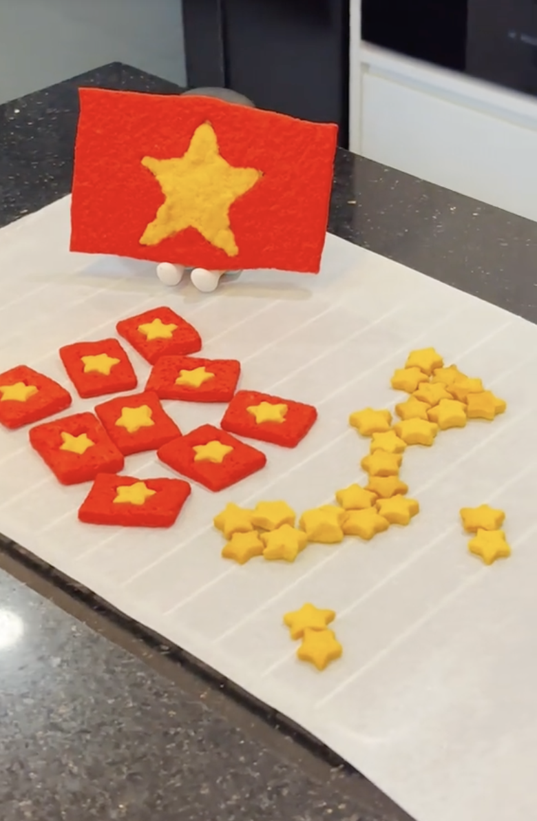 Để bày tỏ lòng tự hào về đất nước mình, chị Đỗ Thu Ngọc (35 tuổi, giáo viên tại Hà Nội) mang đến vẻ đẹp mới cho món bánh xu xê truyền thống bằng cách tạo nền đỏ rực rỡ của quốc kỳ cho chúng, điểm thêm ngôi sao vàng chói lọi.