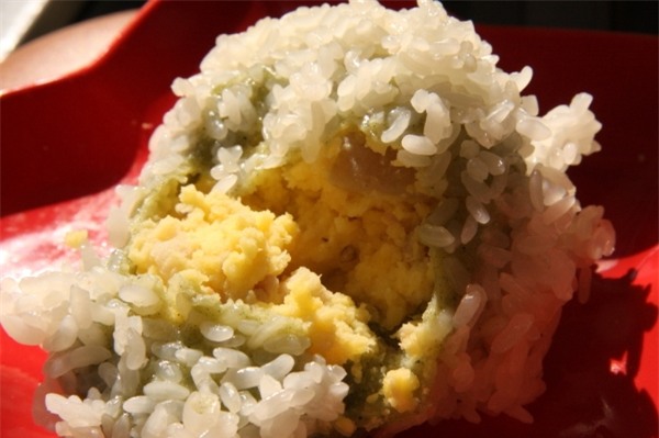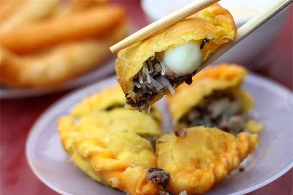 miếng trứng gà luộc hay quả trứng cút con con. Vỏ bánh làm từ bột mì,