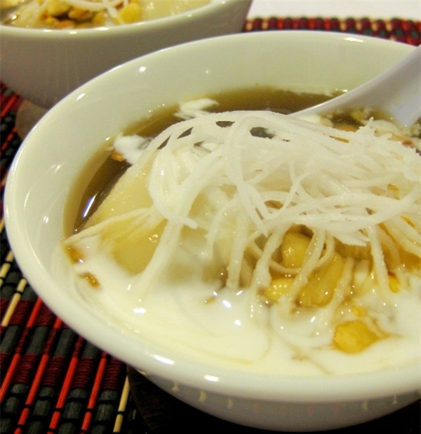 là thêm một chút dừa nạo vào cùng nhân bánh. Nước chan sóng một màu nâu