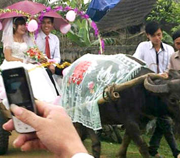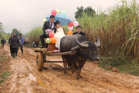 Cô dâu được chú rể rước về dinh không phải trên chiếc xế hộp bóng loáng, tiền tỷ mà trên chiếc “siêu xe”... trâu kéo.