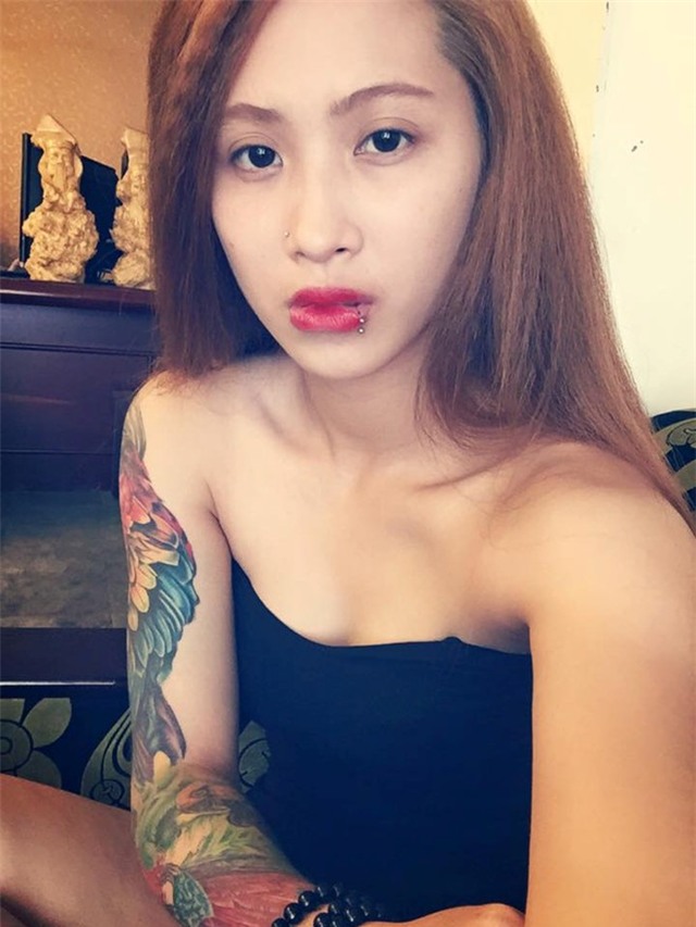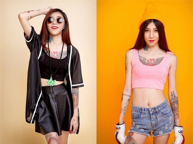 | Tháng 4 vừa qua, Đậu Thị Kim Thoa (22 tuổi, quê Nghệ An) trở thành tâm điểm chú ý trên mạng cũng nhờ quan điểm "dùng hình xăm thay trang sức mỗi khi ra đường". Nếu các cô gái khác làm đẹp bằng những phụ kiện như dây chuyền, nhẫn... thì Thoa lại thích để lộ các họa tiết trên cơ thể. Ảnh: NVCC. |