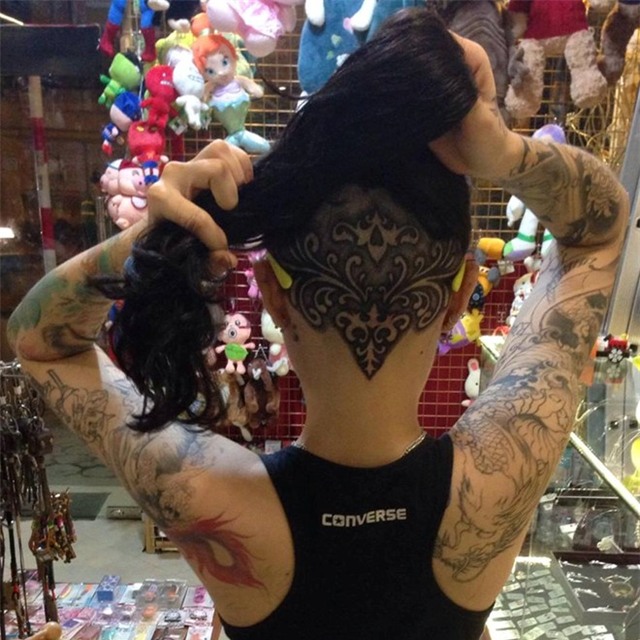 | Hình xăm trên đầu của Na Bia được thực hiện vào tháng 8/2014. Cô đã phải cạo sạch tóc ở phía sau gáy, sau đó mất hơn 7 tiếng chịu đau đớn để hoàn thiện tác phẩm. 8X cho biết, họa tiết này cô dự định làm từ lâu nhưng bây giờ mới thực hiện được và chỉ coi đó như đồ trang sức. Hình ảnh này của Na Bia nhanh chóng được lan truyền trên mạng xã hội. Ảnh: FBNV. |