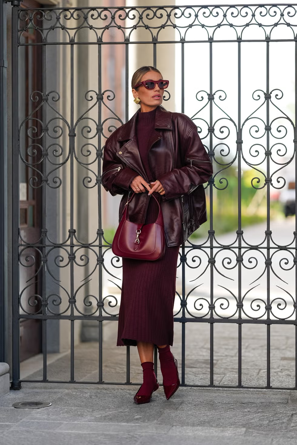 Màu đỏ tía tông đậm luôn được yêu thích, vì vậy phối với item nào cũng khiến cho diện mạo của bạn trendy hơn. Để tăng thêm sự ấn tượng, hãy bổ sung áo khoác da tông đỏ, cùng với một đôi giày cao gót mũi nhọn. Chắc chắn không thể thiếu trang sức chunky để diện mạo của bạn thêm thu hút!