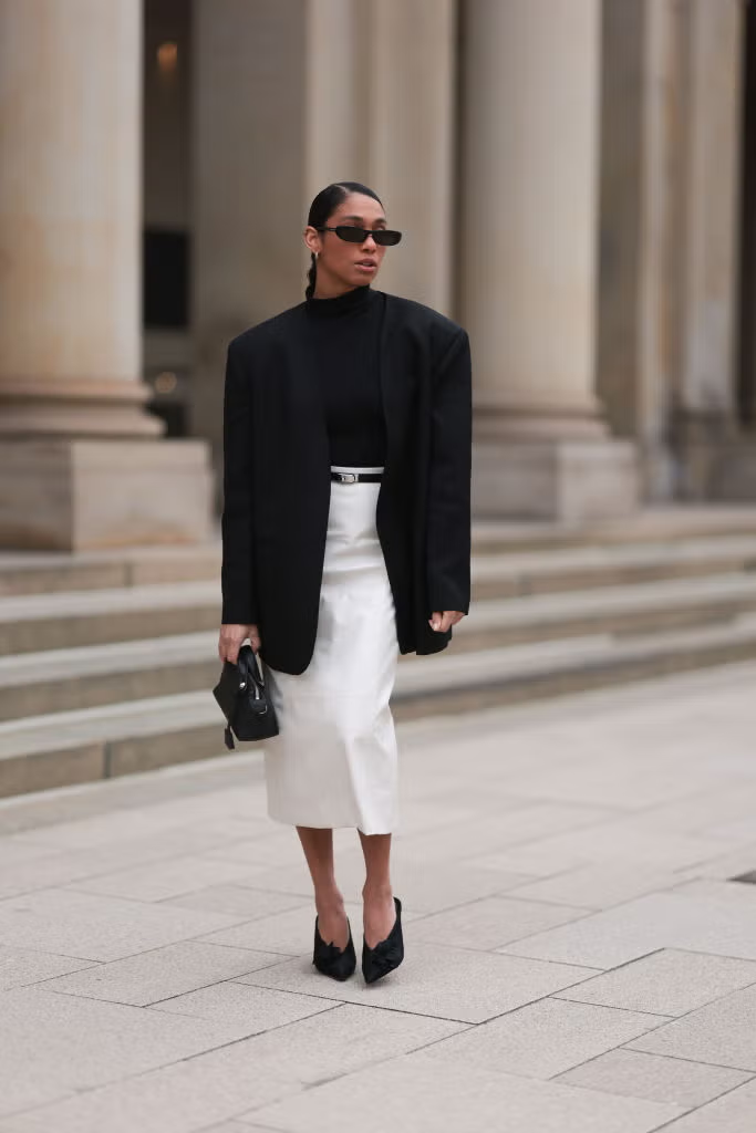 Công thức này luôn mang lại cảm giác quyền lực và sang trọng. Một chiếc áo cổ lọ bó sát, phối cùng chân váy bút chì và áo khoác blazer oversized chắc chắn sẽ khiến bạn trông sang chảnh mọi nơi mọi lúc.