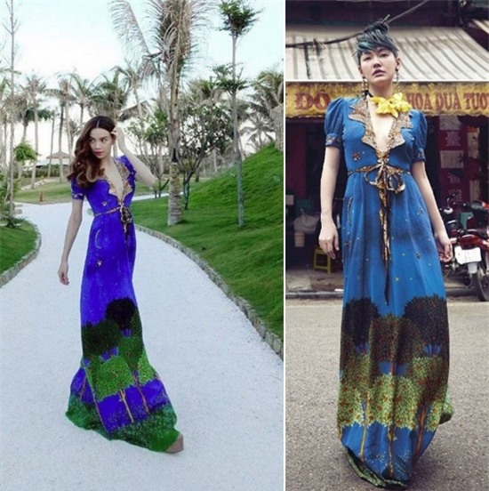 Mới đây, Hà Hồ "đụng hàng" chiếc váy dài thướt tha gam màu xanh mát mắt với nữ MC đình đám Từ Hy Đệ. Được biết, váy nằm trong bộ sưu tập của nhà mốtGucci và có giá khoảng 120 triệu đồng. So hai ngôi sao, khó có thể "chấm điểm" được ai quyến rũ hơn ai.