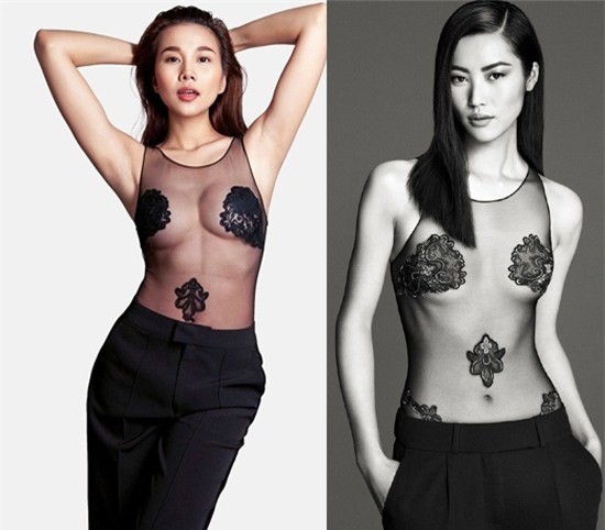 Thanh Hằng và siêu mẫu Liu Wen đều khoe tối đa vẻ đẹp gợi cảm của hình thểtrong chiếc bodysuit xuyên thấu của hãng La Perla.