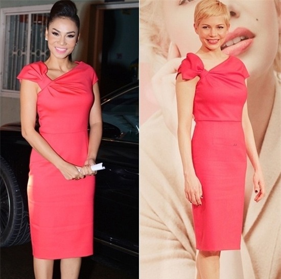 Nữ ca sĩ "Đường cong" Thu Minh từng "cạnh tranh" nhan sắc với nữ diễn viênMichelle Williams trong chiếc váy hồng lệch vai hiệu Valentino. Sản phẩmcó giá khoảng hơn 40 triệu đồng.