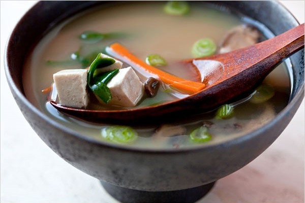 Canh miso: Đây là món ăn không thể thiếu trong bữa cơm của người Nhật. Món canh này được làm từ nước dùng dashi nấu với tương miso và một số nguyên liệu khác như đậu phụ, rong biển, nấm. Ảnh: Nytimes.