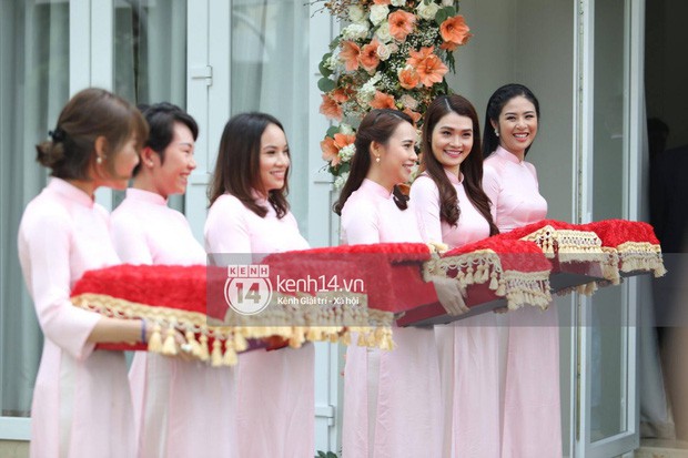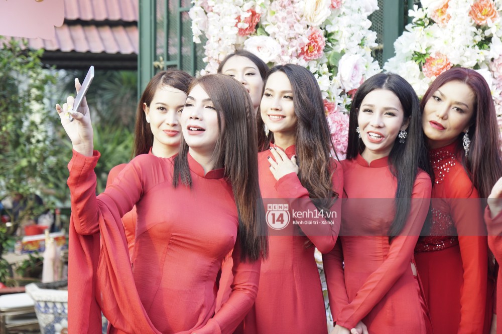 Thanh Trúc , Nguyệt Ánh, Ngọc Thuận, Tường Vy… diện áo dài đỏ nổi bật trong lễ ăn hỏi của Lương Thế Thành và Thúy Diễm.