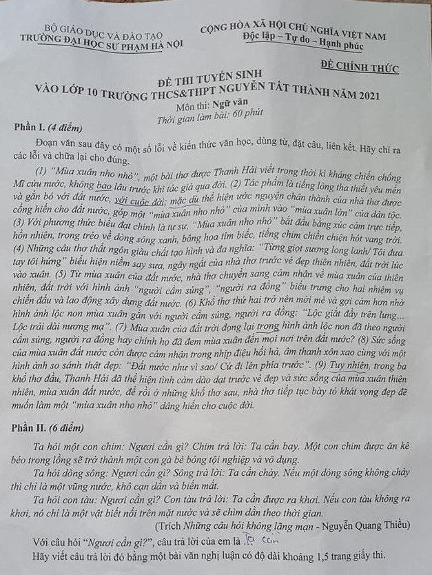 | Đề thi Ngữ văn của Trường THCS&THPT Nguyễn Tất Thành |