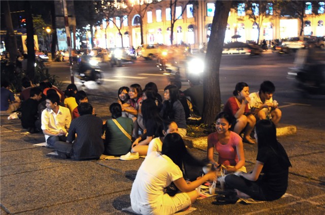 khoảnh khắc vui vẻ bên nhau. Địa điểm cafe bệt phổ biến nhất Sài Gòn là ở công viên 30/4, nơi hội tụ các cảnh