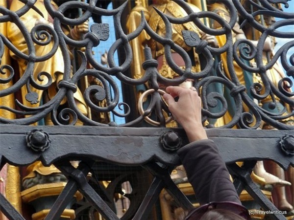 nằm ở chợ trung tâm của Nuremburg. Đài phun có hai vòng đồng ở hai bên,