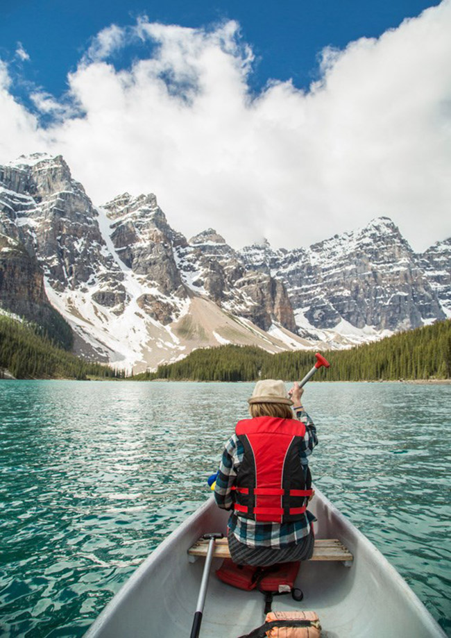 Vườn quốc gia Banff, Alberta: Một cách tuyệt vời để giải căng thẳng là ngồi trên thuyền thả hồn ngắm hồ nước và chiêm ngưỡng Vườn Quốc gia Banff là nơi có những dãy núi phủ tuyết đẹp long lanh.