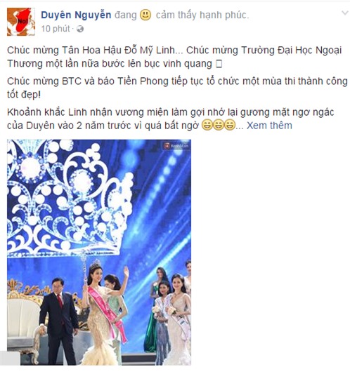 Cô chia sẻ những cảm xúc của mình khi nhớ lại khoảnh khắc đăng quang của mình 2 năm trước đó đồng thời tỏ ra nhắn nhủ Đỗ Mỹ Linh luôn bản lĩnh và vững tin khi ở cương vị mới. Kỳ Duyên viết: