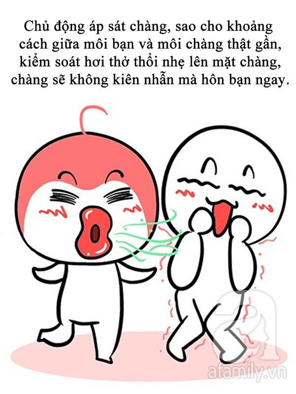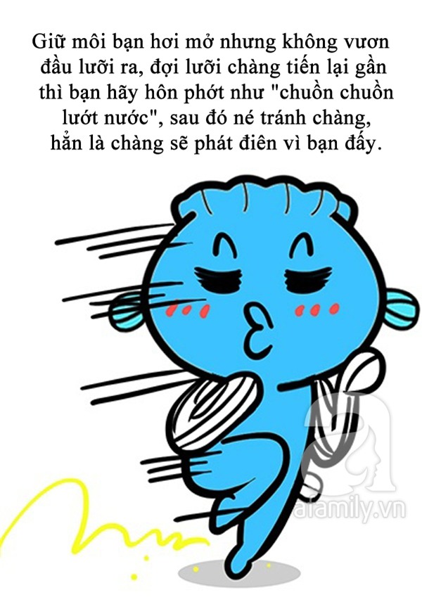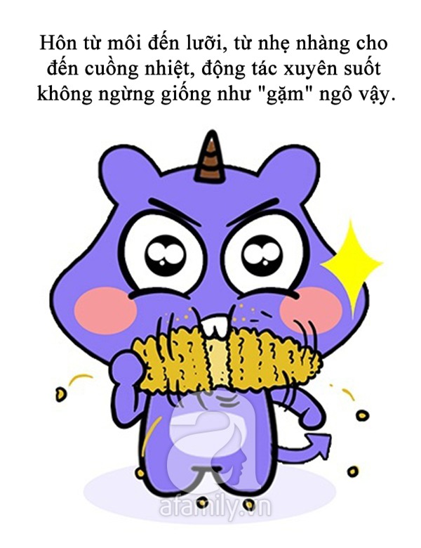 Tất cả là bản năng, thường không có ai dạy bạn về nụ hôn. Hôn từ môi đến lưỡi, từ nhẹ nhàng cho đến cuồng nhiệt, động tác xuyên suốt không ngừng giống như "gặm" ngô vậy.