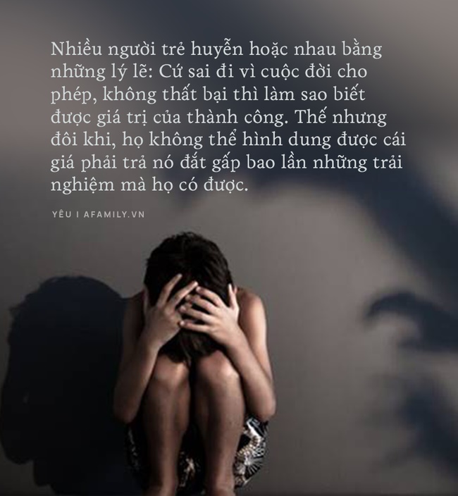 Nhiều người trẻ huyễn hoặc nhau bằng những lý lẽ: Cứ sai đi vì cuộc đời cho phép, không thất bại thì làm sao biết được giá trị của thành công. Thế nhưng đôi khi, họ không thể hình dung được cái giá phải trả nó đắt gấp bao lần những trải nghiệm mà họ có được. Và tất nhiên, bạn không thể ngã nhiều lần trên cùng 1 chỗ. Tình cảm và cả thể xác không phải là thứ để bạn phung phí. Bởi dù nó là quyền sở hữu của bạn nhưng những đau khổ, hệ lụy mà những bước đi sai lầm mang lại có thể ảnh hưởng đến cả người thân của bạn.