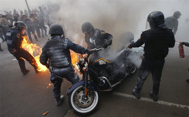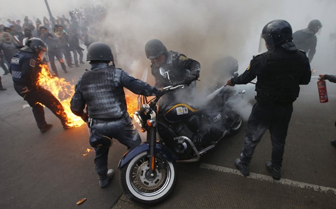 | Xe máy của cảnh sát Mexico trúng bom xăng trong cuộc biểu tình đánh dấu 8 tháng kể từ khi các sinh viên trường Ayotzinapa mất tích hàng loạt. 43 sinh viên đã biến mất sau những va chạm với lực lượng cảnh sát Iguala vào ngày 26/9/2014. Sự việc nhanh chóng trở thành vụ bê bối an ninh công cộng lớn nhất cho đến nay mà tổng thống Mexico phải đối mặt. Ảnh: Reuters |