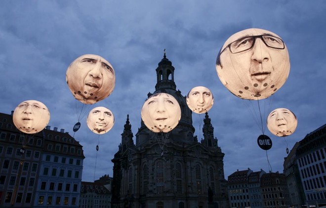 | Khinh khí cầu in hình các nhà lãnh đạo G7 trên bầu trời khu vực nhà thờ Frauenkirche trước khi cuộc họp Bộ trưởng Tài chính của nhóm diễn ra hôm 27/5 tại thành phố Dresden (Đức). Ảnh: Reuters |