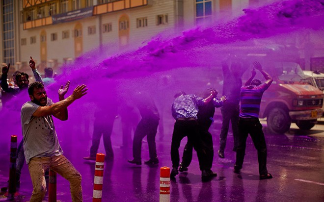 | Cảnh sát phun nước màu vào những người biểu tình đòi tăng lương ở thành phố Srinagar, Ấn Độ, hôm 29/5. Ảnh: Getty |
