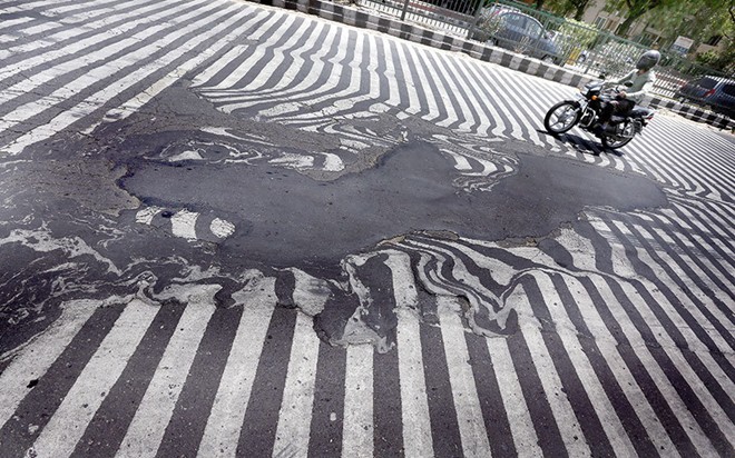 | Mặt đường gần bệnh viện Safdarjung tại thủ đô New Delhi biến dạng ngày 26/5. Nắng nóng kỷ lục gần 50 độ C tại Ấn Độ những ngày qua khiến hơn 2.000 người thiệt mạng. Thời tiết bất thường tác động xấu tới sức khỏe người dân quốc gia Nam Á. Ảnh: Hindustan Times |
