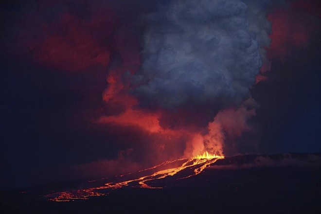 | Núi lửa Wolf phun khói và nham thạch đỏ rực trên đảo Isabela thuộc vườn quốc gia Galapaos của Ecuador hôm 25/5. Ảnh: Reuters |