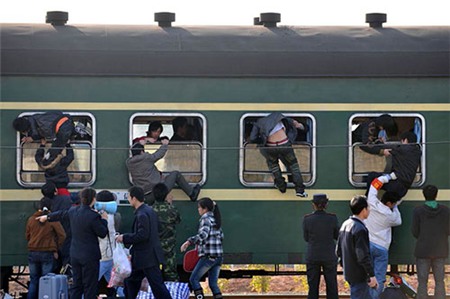 Hành khách trèo qua cửa sổ để lên tàu ở nhà ga Huệ Châu vào dịp Tết năm 2009. (Ảnh: CFP) |