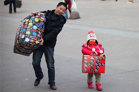 Hai cha con mang hành lý ra bến xe buýt ở Thanh Đảo, tỉnh Sơn Đông vào hôm 18/1/2014. (Ảnh: CFP) |