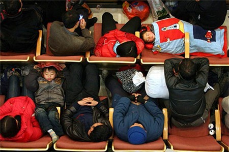 Hành khách nằm đợi tàu ở nhà ga Hàng Châu. (Ảnh: CFP) |