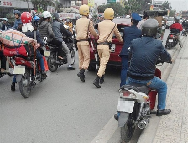 Những ngày giáp Tết, khi lượng phương tiện giao thông di chuyển trên đường hàng ngày luôn trong tình trạng đông nghẹt thì việc chết máy, kẹt xe luôn là nỗi ám ảnh với các ‘tay lái’. Ngày 29 Tết Âm lịch, một chiếc ôtô chết máy trên đường Âu Cơ (Hà Nội) đã nhận được sự trợ giúp của 2 chiến sĩ CSGT để được đẩy đến nơi thông thoáng. (Nguồn: Internet).