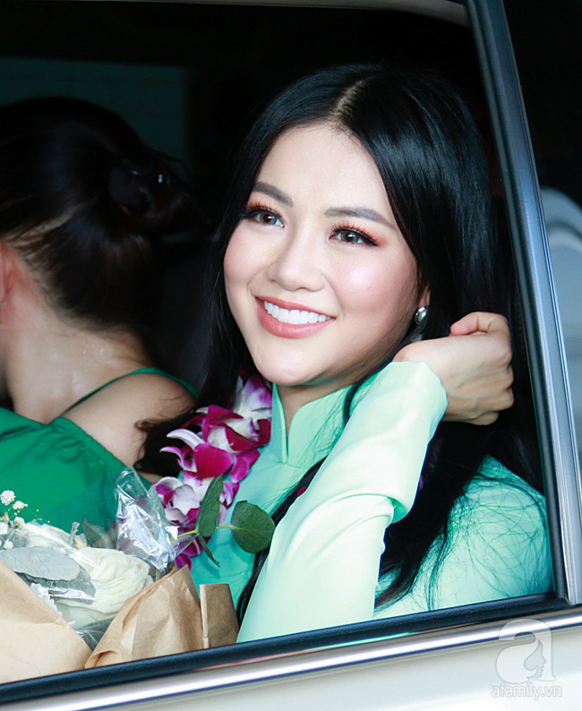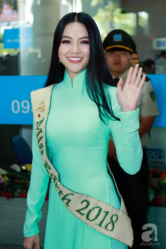 Tân Hoa hậu sau đó đã đi thay trang phục. Cô mặc áo dài xanh đơn sắc rất nhẹ nhàng nhưng không kém phần nổi bật, dặm thêm một chút son phấn lên gương mặt sau chuyến bay dài.