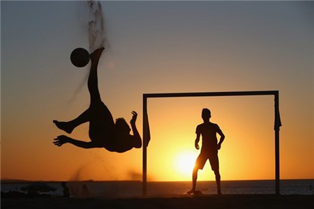 Những đứa trẻ đường phố đá bóng trên bãi biển Fortaleza, Brazil dưới ánh hoàng hôn lãng mạn.