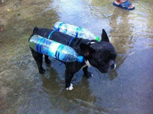 Không chỉ người, vật nuôi cũng được trang bị thêm dụng cụ để sống sót trong mùa lụt. Trong ảnh, chú chó nhỏ được trang bị hai chiếc phao tự chế bằng vỏ chai.