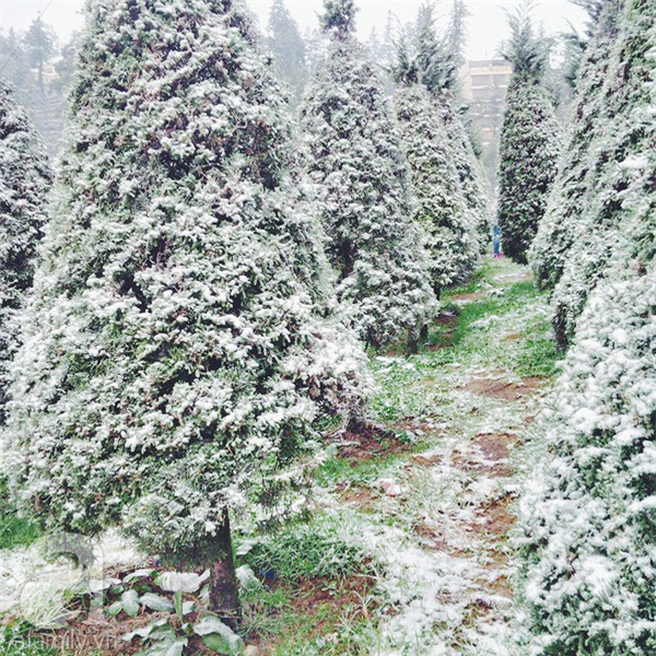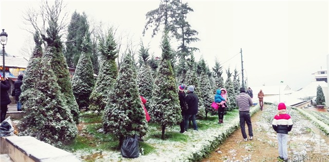 Ở khu vực sân vận động Sapa, những cây thông phủ trắng băng tuyết.