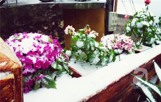 Tuyết phủ trên hoa các cây hoa ven đường.