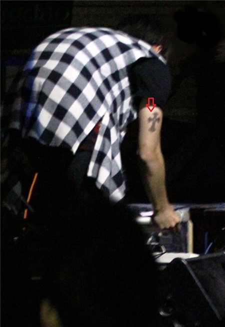 | Hình xăm thánh giá đằng sau bắp tay của Sơn Tùng M-TP được người hâm mộ bắt gặp trên sân khấu cách đây không lâu. |