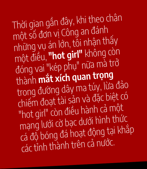 Thời gian gần đây, khi theo chân một số đơn vị Công an đánh những vụ án lớn, tôi nhận thấy một điều, "hot girl" không còn đóng vai "kép phụ" nữa mà trở thành mắt xích quan trọng trong đường dây ma túy, lừa đảo chiếm đoạt tài sản và đặc biệt có "hot girl" còn điều hành cả một mạng lưới cờ bạc dưới hình thức cá độ bòng đá hoạt động tại khắp các tỉnh thành trên cả nước.