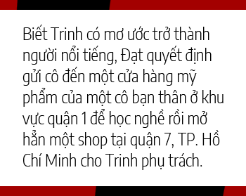 Biết Trinh có mơ ước trở thành người nổi tiếng, Đạt quyết định gửi cô đến một cửa hàng mỹ phẩm của một cô bạn thân ở khu vực quận 1 để học nghề rồi mở hẳn một shop tại quận 7, TP. Hồ Chí Minh cho Trinh phụ trách.