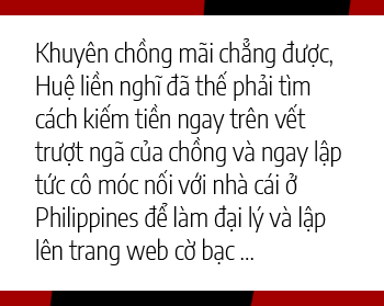 Khuyên chồng mãi chẳng được, Huệ liền nghĩ đã thế phải tìm cách kiếm tiền ngay trên vết trượt ngã của chồng và ngay lập tức cô móc nối với nhà cái ở Philippines để làm đại lý và lập lên trang web cờ bạc có tên miền là www.12bet.com.