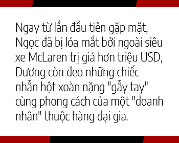 Ngay từ lần đầu tiên gặp mặt, Ngọc đã bị lóa mắt bởi ngoài siêu xe McLaren trị giá hơn triệu USD, Dương còn đeo những chiếc nhẫn hột xoàn nặng "gẫy tay" cùng phong cách của một "doanh nhân" thuộc hàng đại gia. Biết Ngọc thèm khát trở thành diễn viên, người mẫu, Dương lập tức vung tiền sắm cho cô những món đồ hàng hiệu rồi thường xuyên đưa đi dự những sự kiện lớn, nhất là những chương trình biểu diễn thời trang trên khắp cả nước.